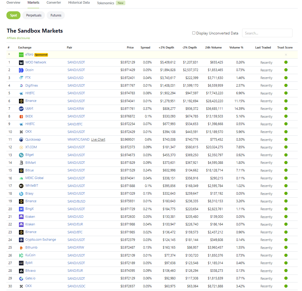 Dans ce guide, nous avons vu comment vous pouvez acheter Sandbox avec Binance, mais il existe d’autres plateformes pour acheter cette crypto-monnaie. Pour savoir où acheter Sandbox, il suffit de se rendre sur coingecko ou coinmarketcap et de rechercher la crypto-monnaie.