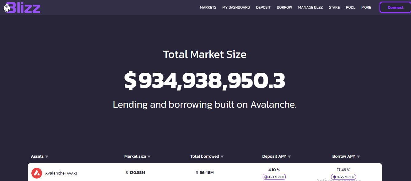 L’onglet principal de Blizz Finance est Marchés. Ici, sous la taille totale du marché, vous pouvez voir le montant du LTV ou la valeur totale bloquée sur cette plateforme.