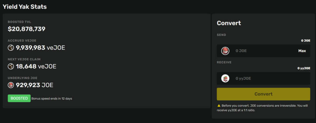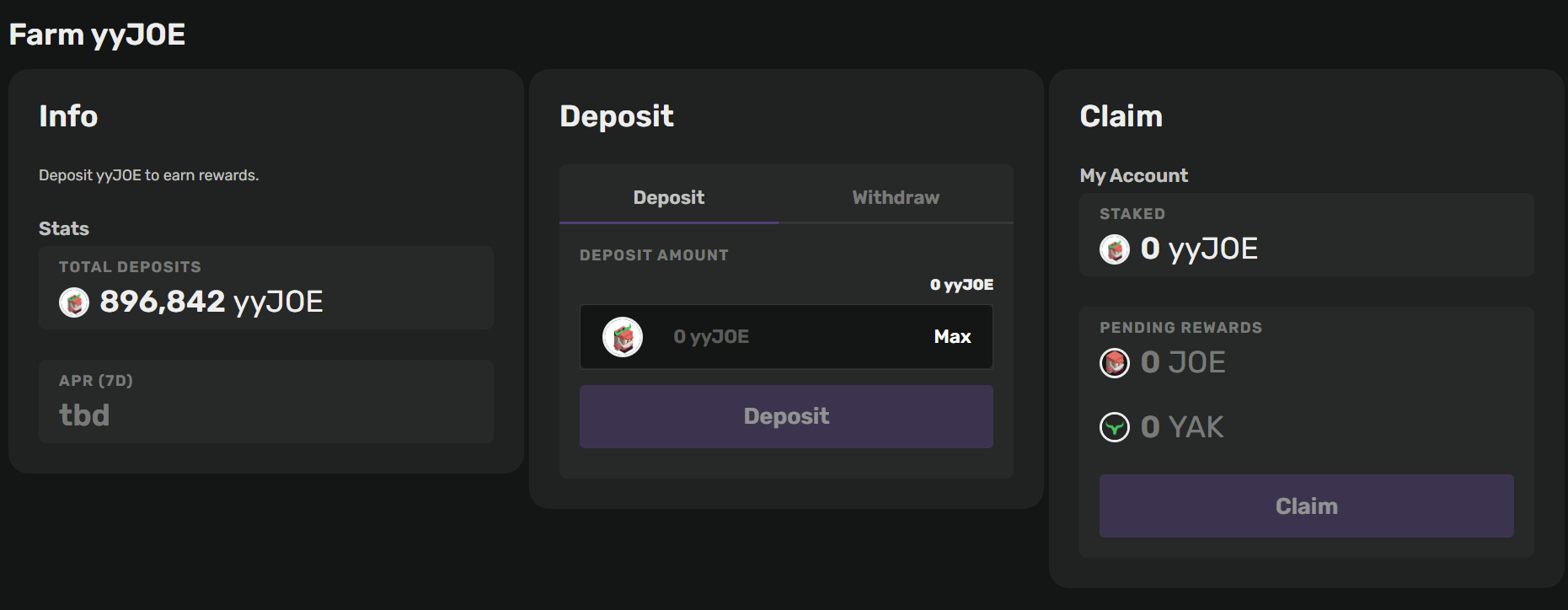 Le fonctionnement est très similaire à celui des plateformes elles-mêmes : vous déposez vos JOE et recevez yyJOE dans un rapport de 1:1. Avec le yyJOE ou le yyPTP, vous pouvez les placer en staking dans le rendement du yak, afin de recevoir le bonus sur les exploitations boostées ci-dessous.