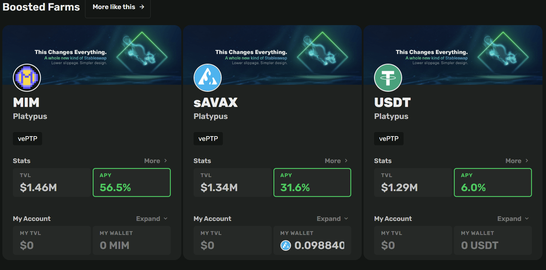Avec l’apparition de tokens tels que veJOE et vePTP, qui vous permettent d’augmenter le % annuel que vous obtenez en faisant du farming dans trader joe (avec veJOE) et platyplus (avec vePTP), yield yak a ajouté ce type de stratégies à sa plateforme avec yyJOE et yyPTP.