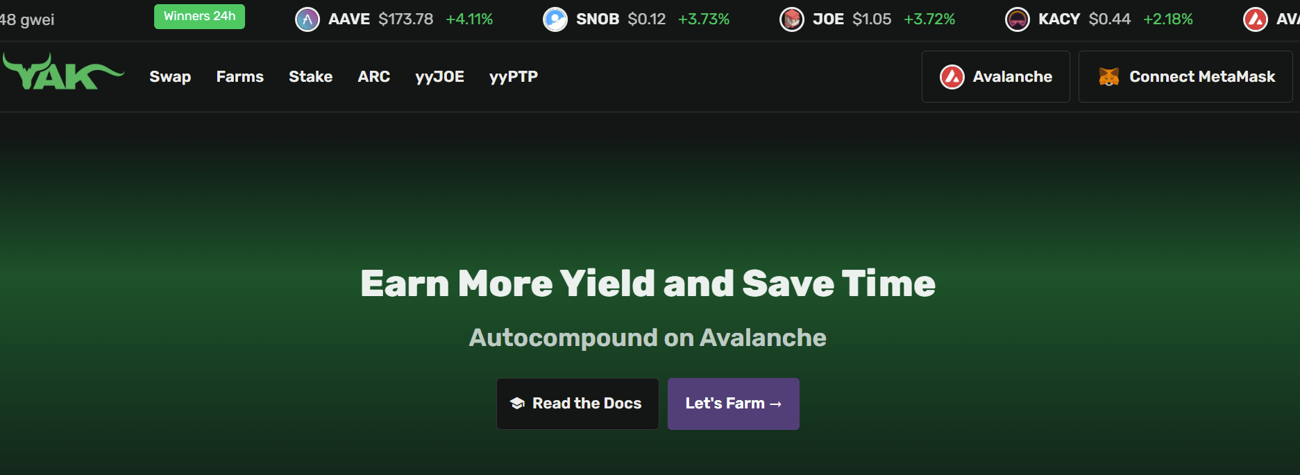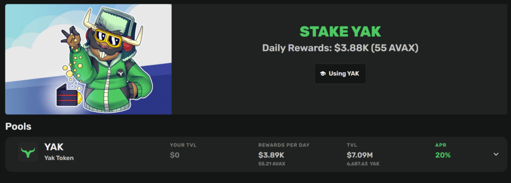 Yield yak est un optimiseur d’exploitation et de staking. Elle est très similaire à d’autres plateformes telles que beefy finance, autofarm, spectrum protocol et bien d’autres. Bien que yield yak soit l’optimiseur le plus populaire et le plus utilisé sur le réseau Avalanche, en raison de la grande variété de possibilités qu’il offre et qui ne se retrouvent pas dans d’autres optimiseurs.