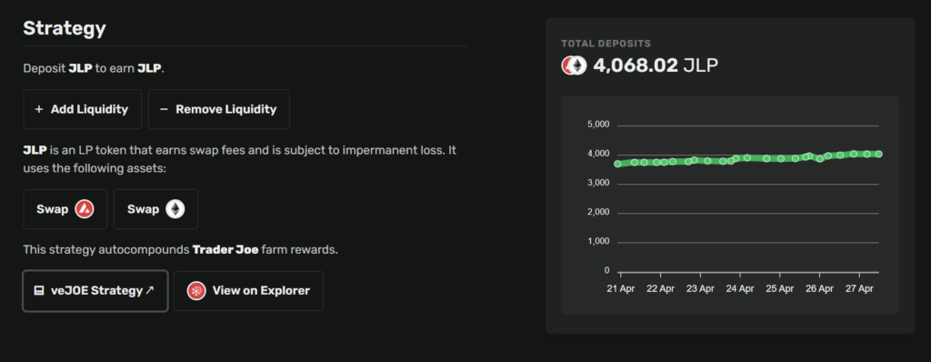 Dans chaque coffre-fort, avant de cliquer dessus, vous verrez la cryptocurrency ou le LP Token dont il s’agit, sous quelle plateforme il est utilisé, le % annuel que vous obtenez en APY, et le montant investi dans ce coffre-fort en TVL. Par exemple, avec USDC-AVAX, nous voyons qu’il s’agit de trader joe, avec un TVL de 7.27 Million et 30.34% APY.