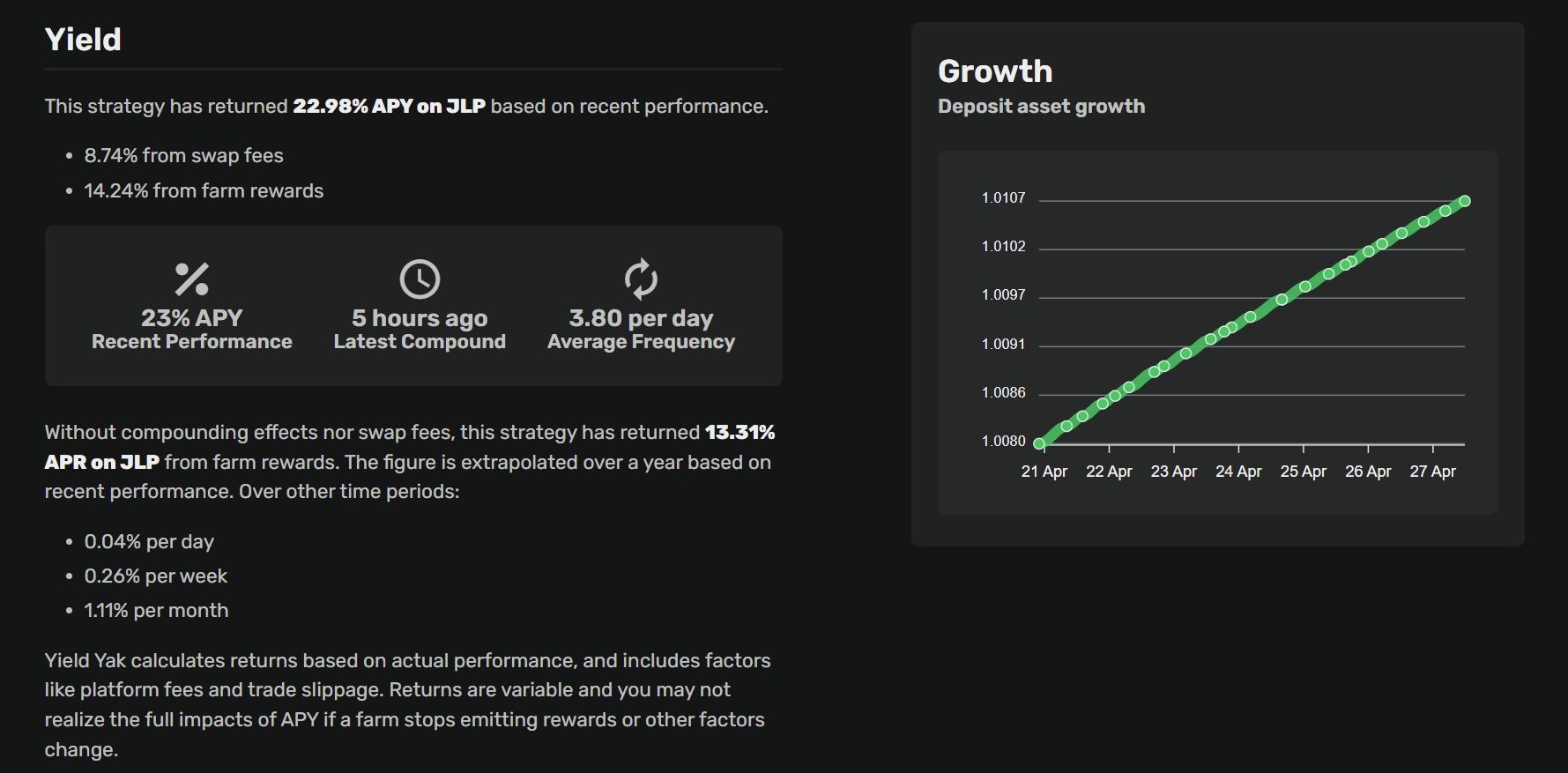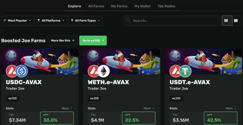 En échangeant votre JOE contre yyJOE, vous aurez accès à ces % annuels plus élevés sur des exploitations telles que usdc-avax, weth-avax, usdt-avax et bien d’autres. Il en va de même pour yyPTP et les exploitations farms disponibles sur cette plateforme. C’est un moyen de pouvoir utiliser un optimiseur avec les nouvelles fonctionnalités des farms boostées directement avec yield yak.