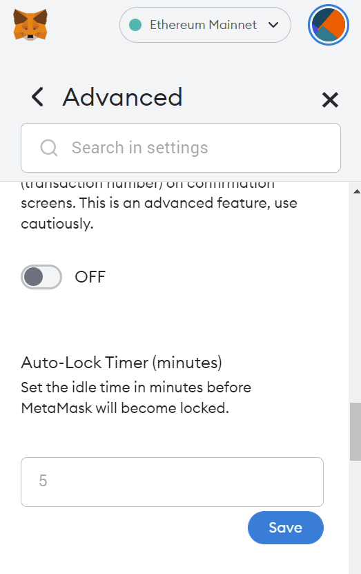 En settings, iremos a advanced o avanzado. Y si bajamos, podrás ver una opción que dice auto-lock timer. Esta es la opción y que podremos indicar una cantidad de minutos para que metamask se bloquee solo pasado ese tiempo des de que dejamos de usar la extensión.