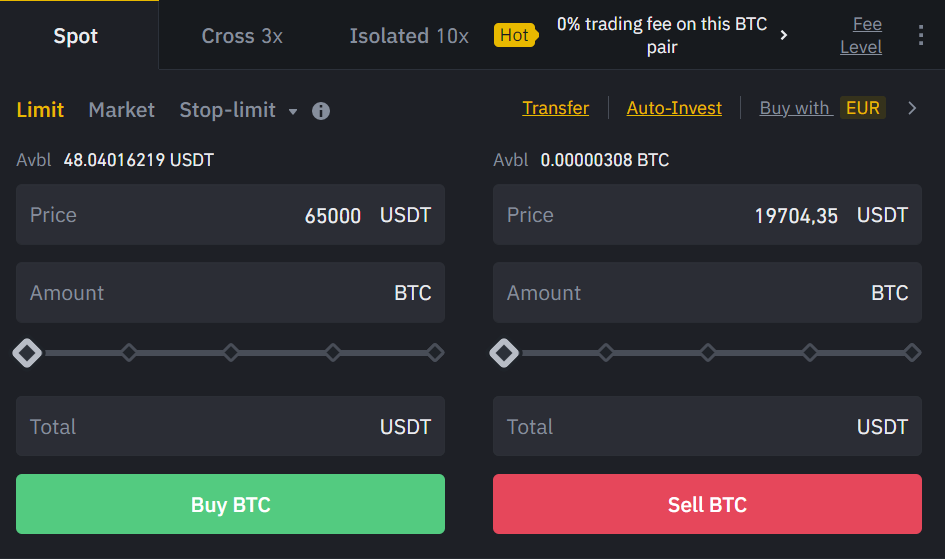 En spot podrás comprar a lÃmite o a mercado entre otras opciones diferentes criptomonedas y tenerlas en tu portfolio, pero al no ser un derivado financiero, no tiene esta opción para colocar TP y SL en tus criptomonedas compradas.