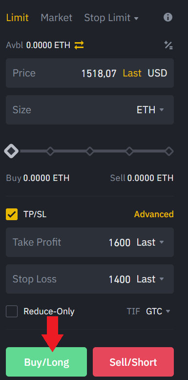 Para colocar el TP y SL, si haces una operación en Largo (Comprar), debes indicar un Take Profit por encima del precio que has comprado, y un Stop Loss con un precio inferior al que has comprado. Por ejemplo, compramos futuros de BTC a 60.000$, el Take Profit puedes colocarlo por encima, por ejemplo, en 63.000$, y el stop loss por debajo, por ejemplo, en 57.000$.