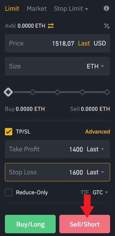 En el caso de ir en Short (Vender), debes indicar un Take Profit por debajo del precio que has comprado, y un Stop Loss con un precio por encima del que has comprado. Por ejemplo, vendemos (Short) futuros de BTC a 60.000$, el Take Profit puedes colocarlo por debjao, por ejemplo, en 57.000$, y el stop loss por encima, por ejemplo, en 63.000$.