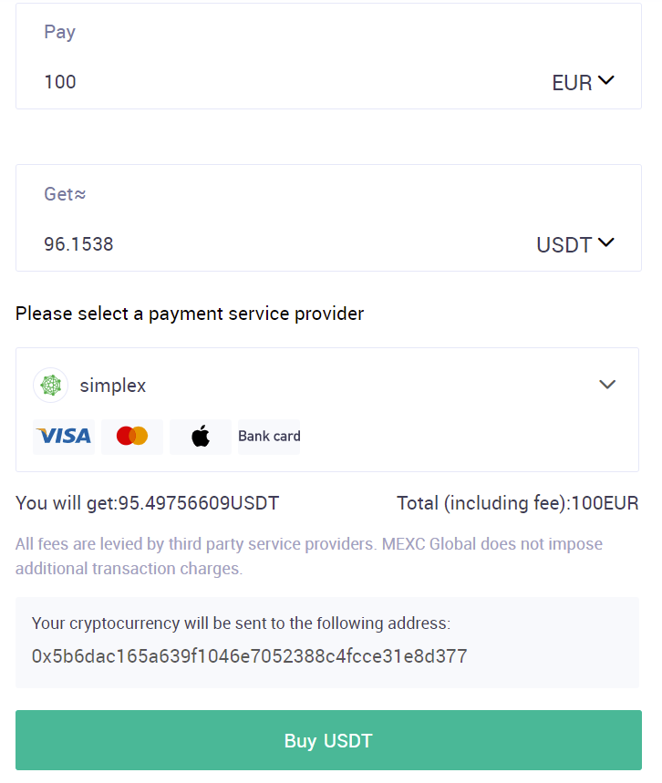 MEXC usa otras empresas que integra con su Exchange como muchos otros exchanges hacen para permitir los depósitos mediante este método de pago. En KuCoin y otros exchanges hemos visto las mismas pasarelas de pago que nos permitirán comprar crypto y depositarlas directamente en nuestro balance de MEXC.