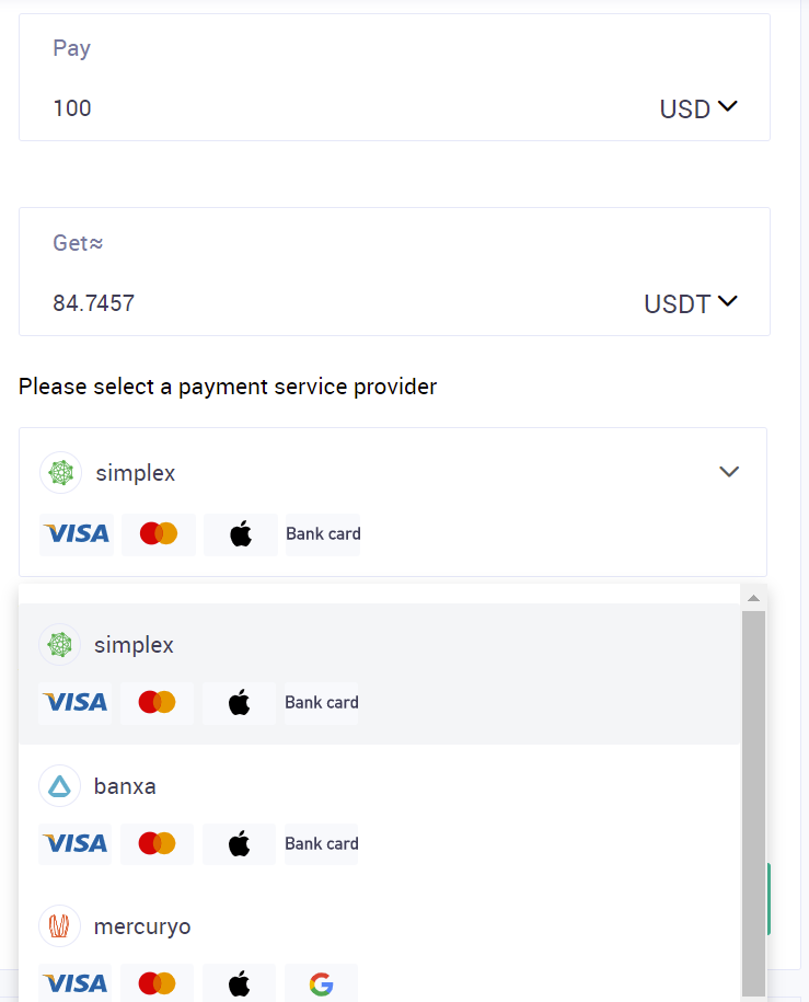 Aquí, en pay indicaremos nuestra divisa, ya sea EUR, USD u otra que tengas en tu cuenta bancaria y usarás para depositar mediante tu tarjeta. En get indicaremos la criptomoneda que queremos comprar. Podremos comprar BTC, ETH y USDT. Mi recomendación es comprar USDT ya que tiene un valor estable y sabrás en todo momento la cantidad que compras. Indica la cantidad, con un mínimo de 100$ o 100 Euros. En get, podrás ver la cantidad que vas a recibir por ese importe, teniendo en cuenta las comisiones que cobra la pasarela de pago. En payment provider podrás ver las diferentes opciones que hay, en este momento encontramos simplex, banxa y mercuryo. Cualquiera de las 3 pasarelas tienen unas comisiones y requisitos muy similares.