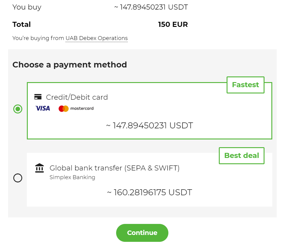 Con esta forma, podrás depositar USDT, BTC o ETH a tu balance mediante estos dos métodos de pago. Ahora, vamos a ver una alternativa para evitar pagar ese 9-11% en comisión usando tu tarjeta de crédito, y una forma con una comisión mucho más pequeña.