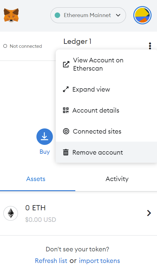 Como puedes ver a continuación, en mi caso con la cuenta de Ledger vinculada a Metamask, al pulsar en los 3 puntos, me aparece la opción de remove account. Y pulsando aquí, y remove se nos eliminaría la cuenta de Metamask.