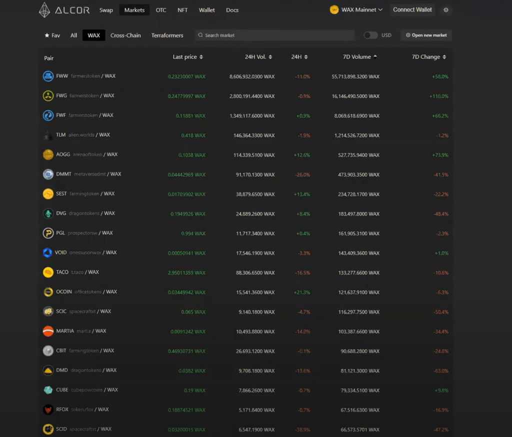 Para hacer esto, podrás ir a Alcor Exchange que es el mercado secundario para poder intercambiar estos tokens. El funcionamiento es el mismo que otros DEX como pancakeswap pero en la red de Wax. Ten en cuenta que no hace falta vender Wood y después comprar gold, sino que puedes intercambiarlo directamente Wood por gold para así evitarte pasos intermedios y comisiones extras.