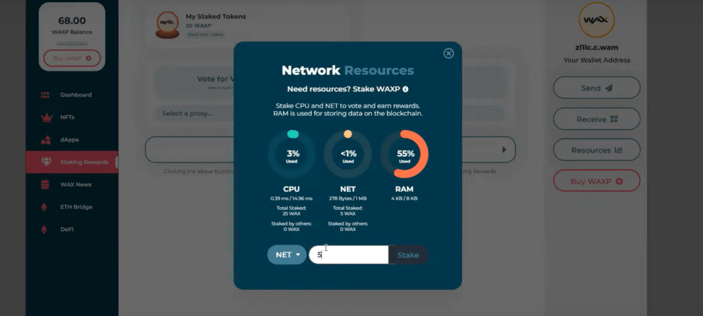 Te recomiendo colocar 5 wax en CPU, 2 en NET y 1-2 en RAM. Indica la cantidad y pulsa en stake. Esto nos permitirá iniciar sesión al juego sin problema. Y no es una cantidad muy elevada de wax que debes colocar aquí en staking. En CPU y NET podrás dejar de stakear en cualquier momento, y todo lo que coloques en RAM no lo vas a poder retirar, ya que se usa para pagar por las comisiones de cada transacción. Al colocarlo, también recibirás recompensas del staking.