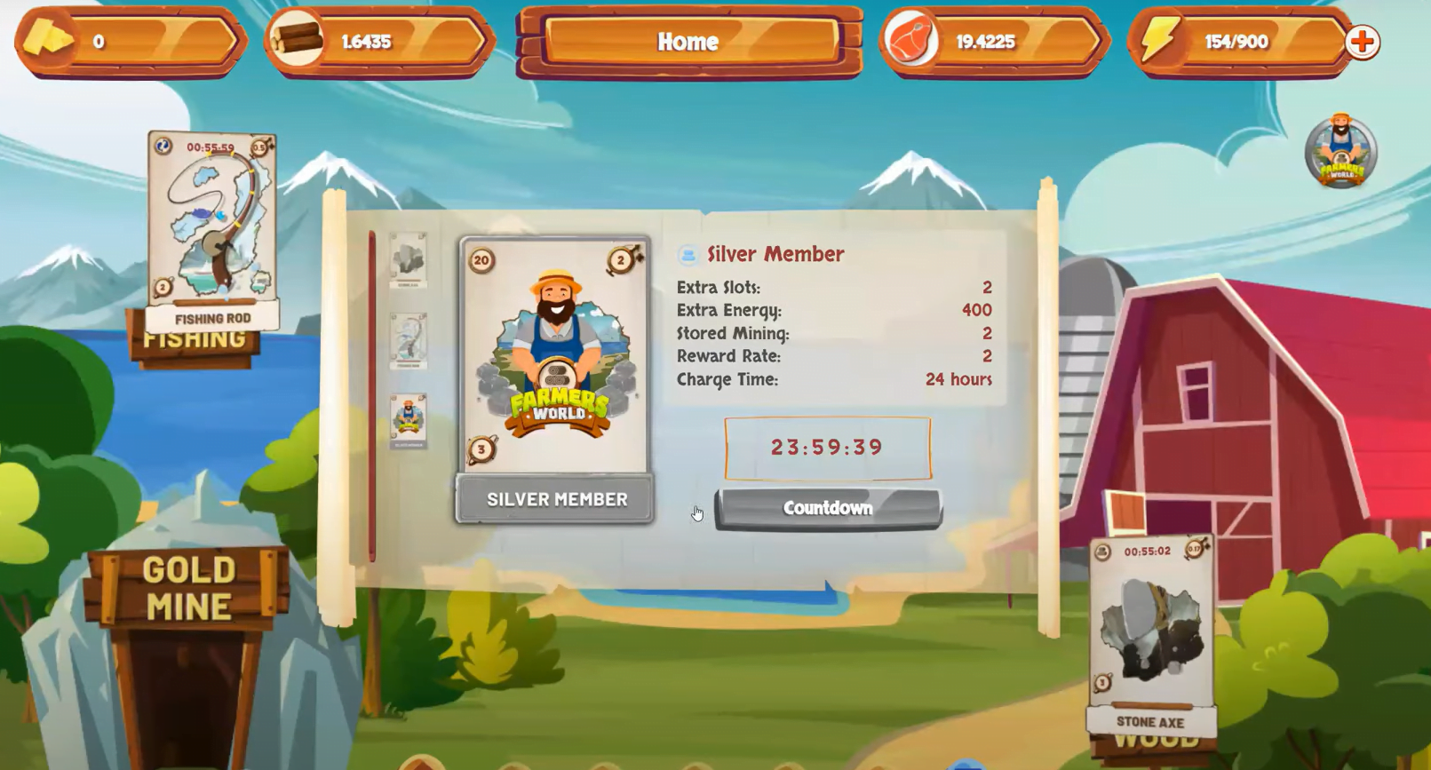 Por ejemplo, con una carta silver member de Wood, podrás acumular 3 horas de recompensas con la Stone axe. Pero no con la fishin rod. Para ello, necesitarías una silver member de food. Otro beneficio de las cartas membership son las recompensas que puedes reclamar cada 24 horas. Donde podrás conseguir Farmer coins. Estas monedas se pueden usar para crear más cartas membership. Una vez consigas 60 farmer coins podrás craftear una membership de bronce, y 120 para una de silver. Esta es la forma de reinvertir en el juego y optimizar así tus ganancias. Los porcentajes de diferentes tipos de cartas, son 70% Wood, 27% food y 3% gold.