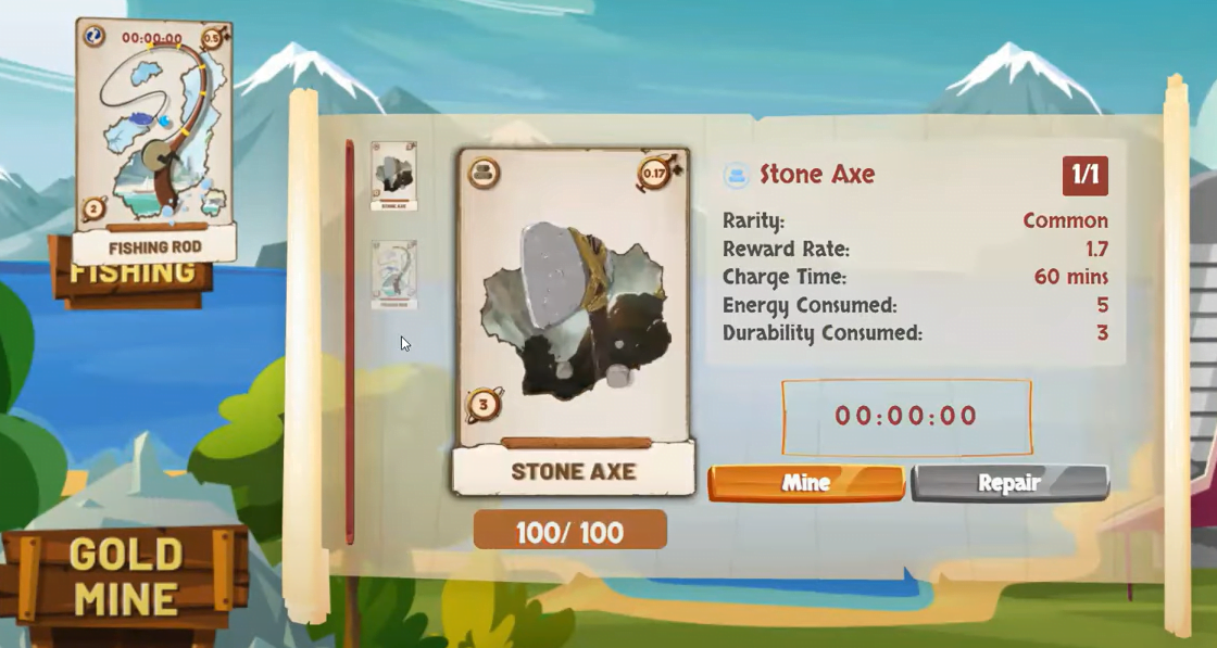 Cuando pulses mine, te aparecerán las recompensas que has conseguido pasado 1 hora. Para la Stone axe, la media es de 1,7 de madera cada hora. En ocasiones es más y en ocasiones es menos que 1,7. Y ahora vuelves a pulsar en mine para recolectarlos dentro de 1 hora. La fishing rod es de 5 de comida de media cada hora.