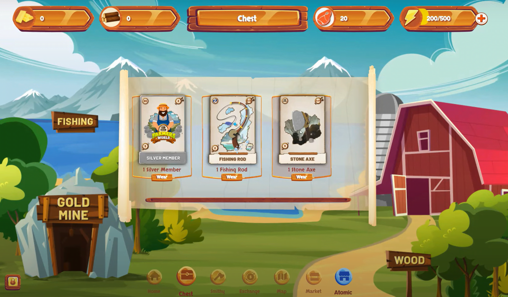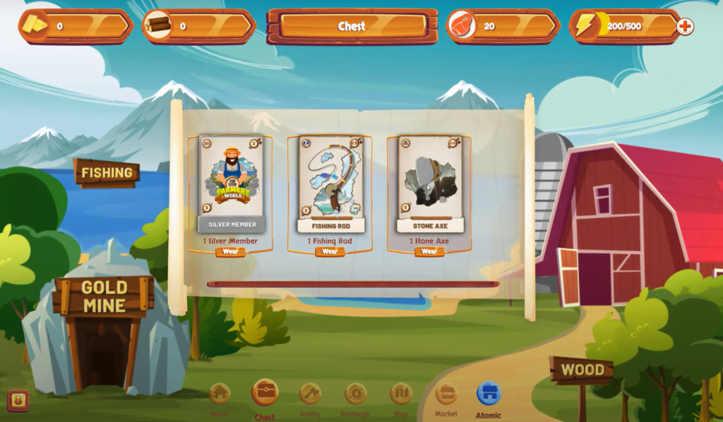 Lo primero que verás al entrar en el juego es el chest o cofre. Aquí es donde verás los NFT’s que tienes. En el caso de lo que hemos comentado, podrás ver la Stone axe y fishing rod. Para poder empezar a poner a trabajar estas herramientas, debes pulsar en wear.