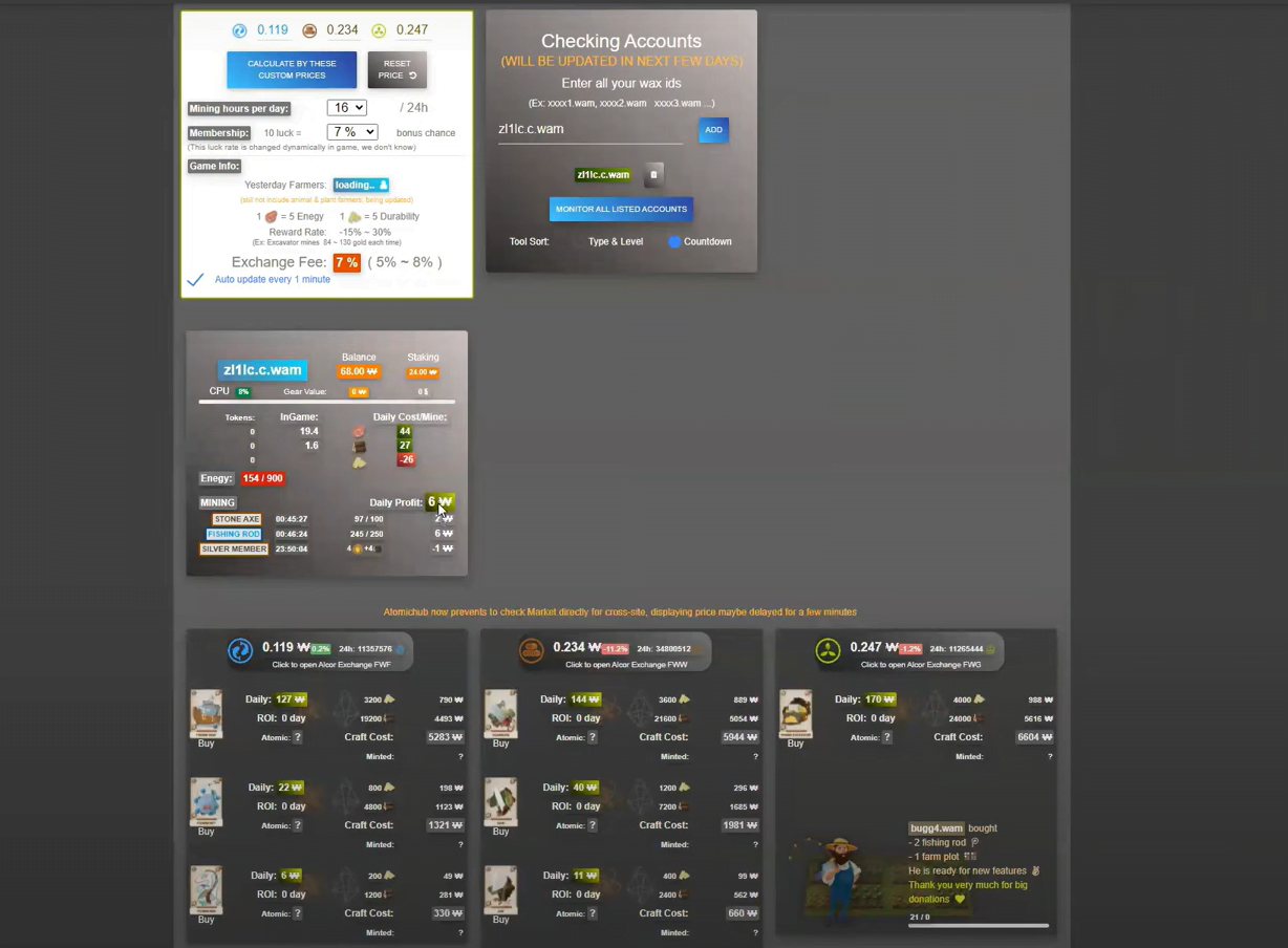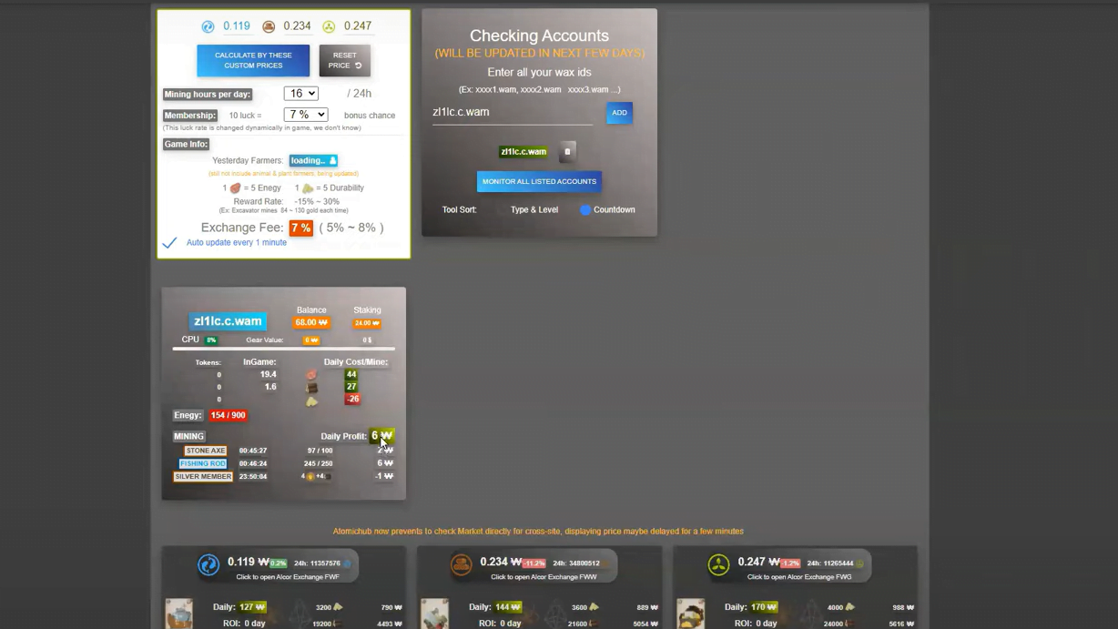 Para saber lo que puedes estar generando cada día, por suerte hay páginas de gran utilidad donde podrás encontrar toda esta información. La página que usaremos es fw.f12key.xyz. Aquí, simplemente introduciremos la dirección de nuestra wallet de wax, y pulsaremos en add y monitor all listed accounts.