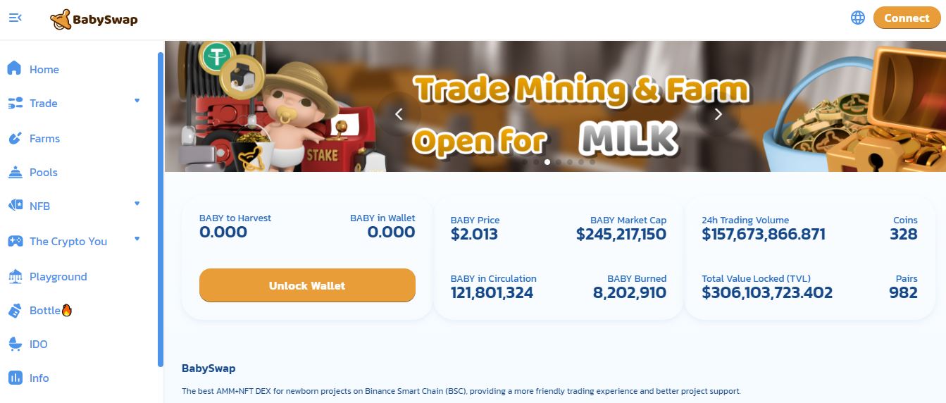 Babyswap es una combinación de muchas otras plataformas en una. Donde tiene diferentes partes relevantes, que le dan una utilidad a su token baby. Lo primero que podrás encontrar es la parte de trade de cualquier DEX clásico, también cuenta con su colección de NFT’s, cuenta con una plataforma de launchpad, donde se lanzan nuevos proyectos para conseguir liquidez y un juego play to earn en desarrollo. Además de una gran comunidad detrás de todo el proyecto.