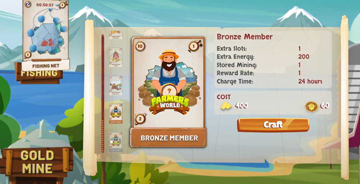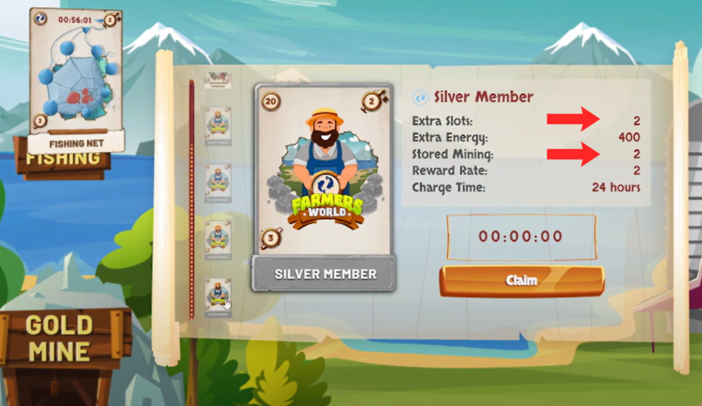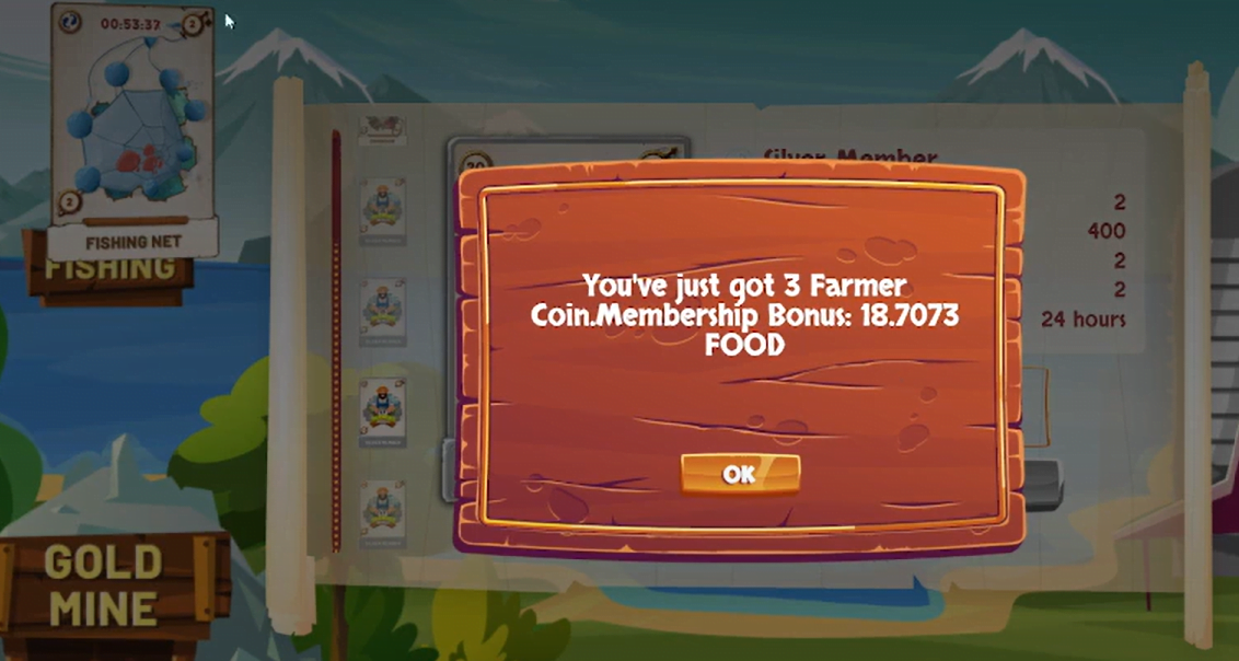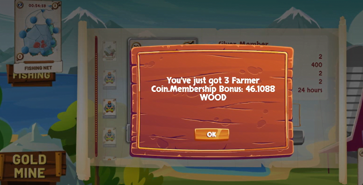 También, cada 24 horas podrás pulsar en claim en cada carta member y recibirás Farmer coins. Bronce recibes de 1-3 y plata de 2-6 farmer coins cada 24 horas. Además, de un membership bonus. Este bonus tienes un % de que al pulsar en claim y reclamar las Farmer coins, también uses la herramienta donde tienes la carta member colocada. Por lo que, si por ejemplo tienes la carta member en una herramienta como Stone axe, recibirás 3 de madera. Si tienes mejores herramientas, recibirás más recompensas, acorde a lo que conseguirías usando esa herramienta. El coste para reclamar este tipo de recompensas, es de 400 de energía. Así que también hay que tenerlo en cuenta.