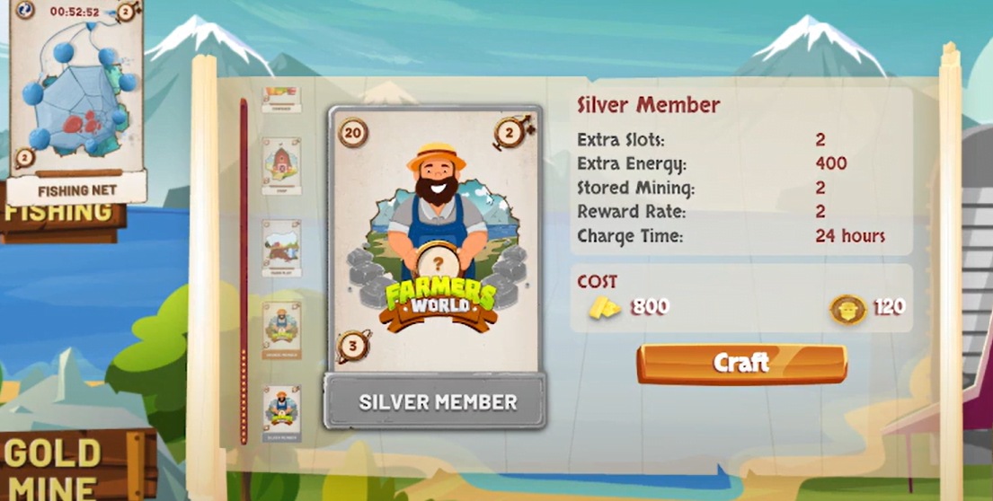 El coste que tiene una carta member bronce es de 400 oro y 60 farmer coins. En el caso de plata, el coste es de 800 oro y 120 farmer coins. Cuando creas una carta member, puede tocarte de los 3 tipos que hemos comentado con las siguientes probabilidades. 70% madera, 27% comida y 3% oro. Por lo que, lo más probable es que te salga de madera.