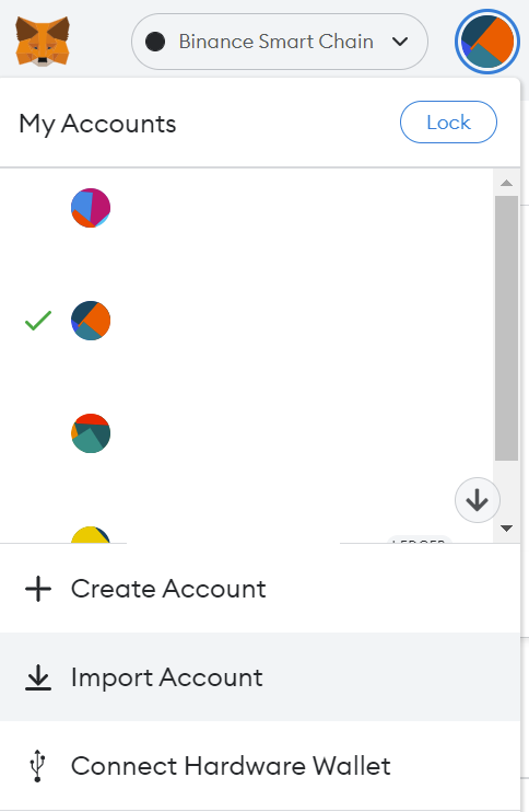 Con la cuenta creada, iremos a arriba a la derecha, y veremos la opción de import account. Pulsamos allÃ. Seleccionamos como opción private key o clave privada y simplemente pegamos la clave privada de la cuenta que queremos importar.