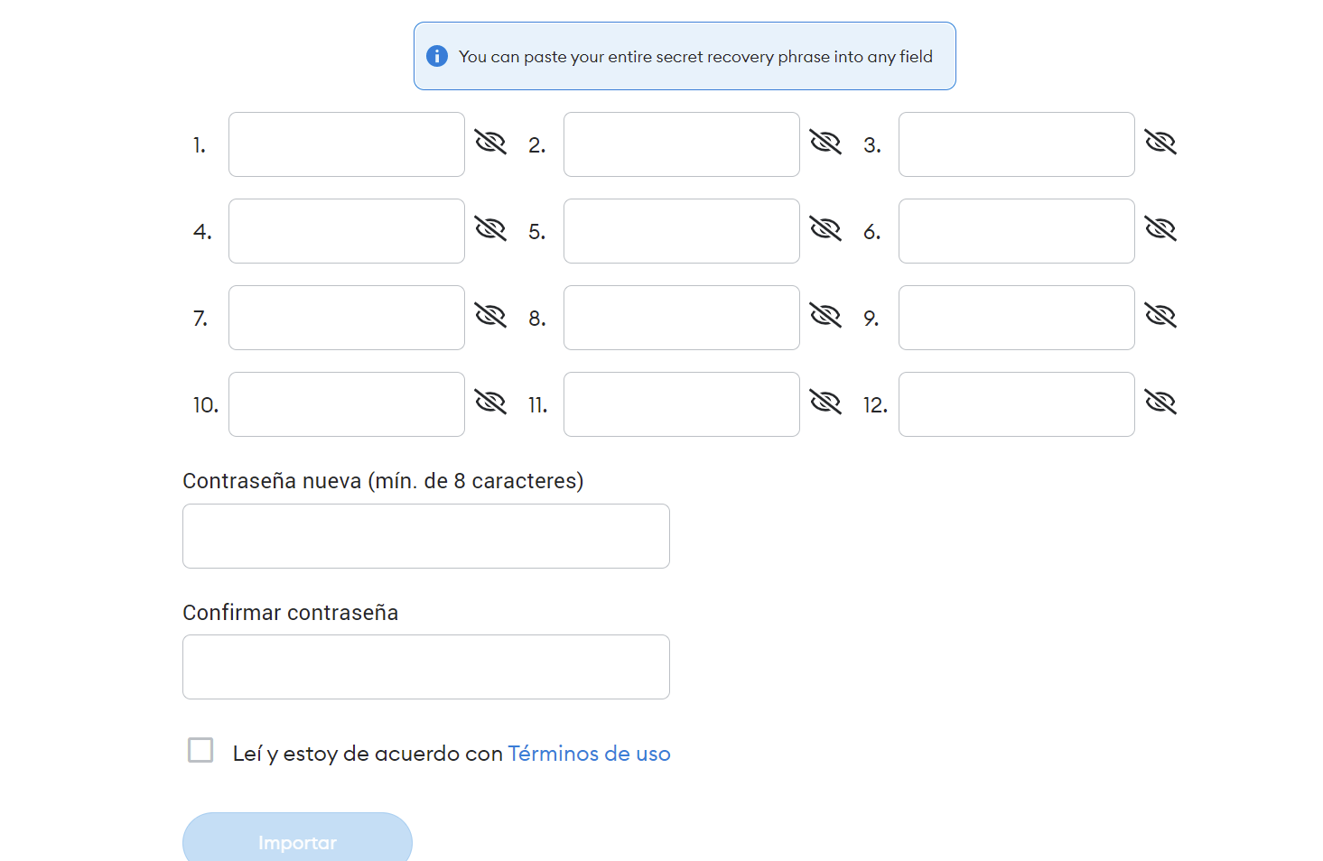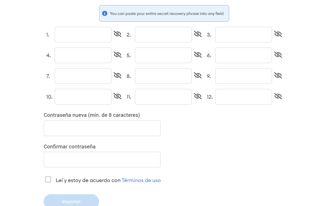 Una vez instalada la app o extensión, pulsaremos en empezar. Después, pulsaremos en importar cartera/wallet. Pulsamos en acepto. Ahora, seleccionaremos primero arriba de cuántas palabras es nuestra seed phrase o frase de recuperación. Habitualmente son de 12 o 24, pero es posible que la tuya sea de 15 18 o 21. Una vez seleccionado el número de palabras, vamos a indicar palabra por palabra nuestra frase de recuperación. Y una vez este toda introducida, indicamos una constraseña y pulsamos en importar.