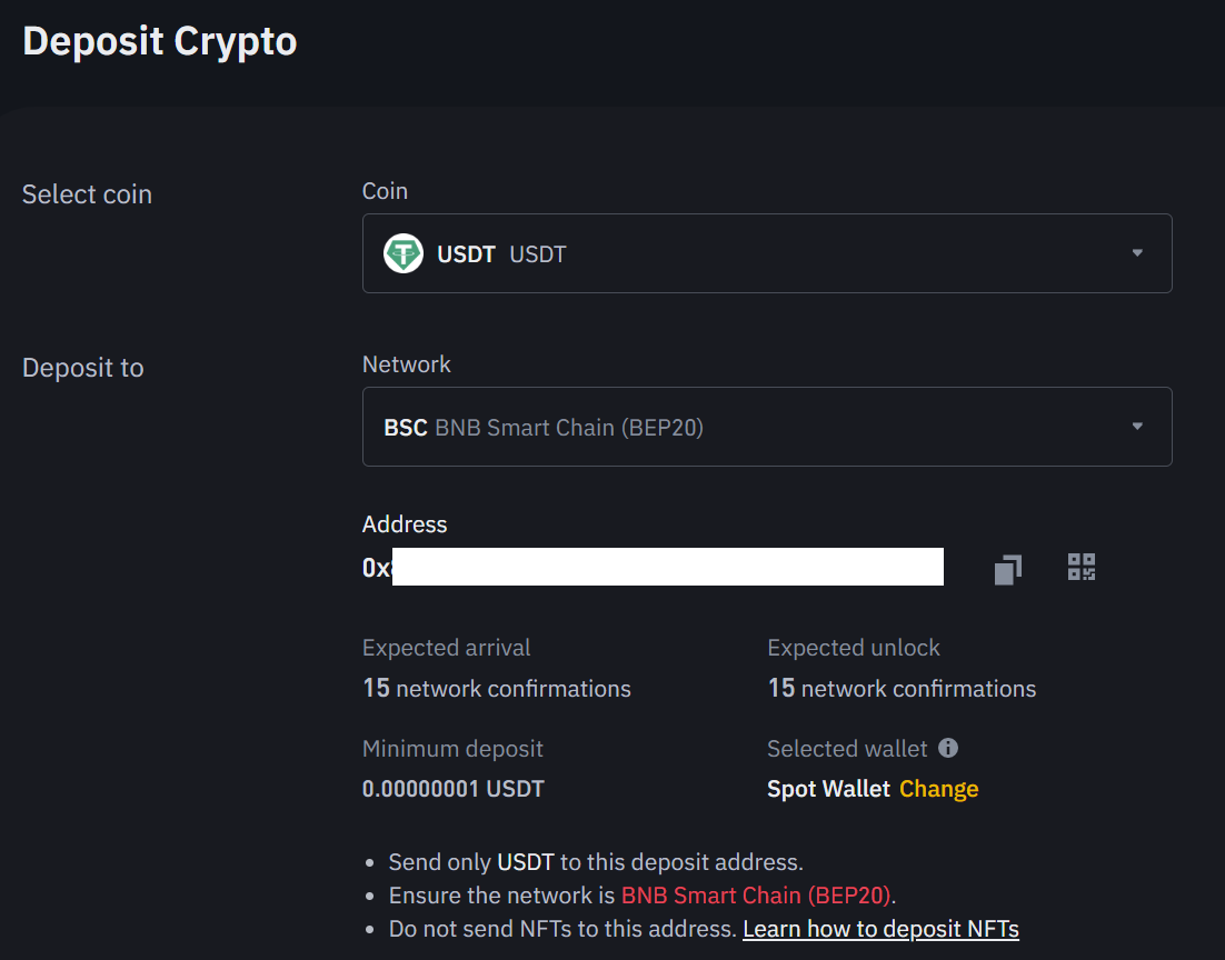 En adress o dirección de cartera, vamos a tener que copiar la dirección de tether de binance. Para ello, vamos a ir a billetera, billetera spot, y buscamos USDT. AquÃ, pulsa en depositar, y marcamos la red bep20.