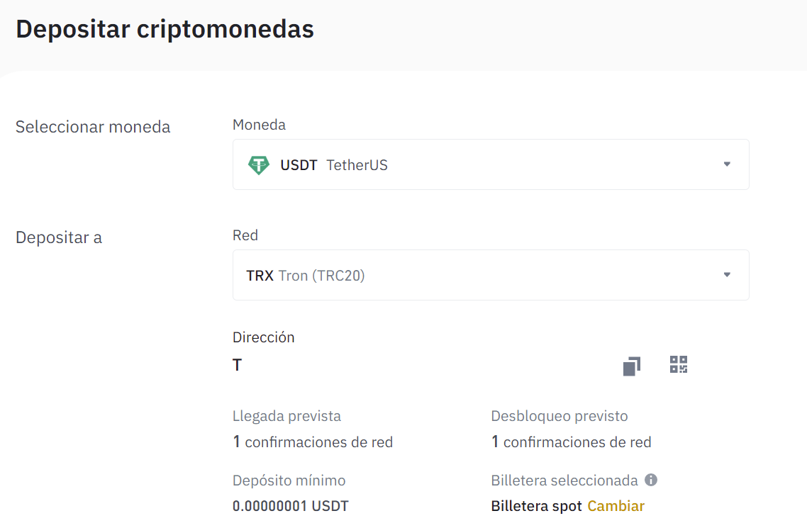 Para esto, iremos a billetera, billetera spot, y buscar USDT. AquÃ, pulsar en deposit/depositar, y seleccionar la red/network Tron, y copiar la dirección de Binance. Selecciona la dirección para copiarla o hay botones para que se copie con un solo click.