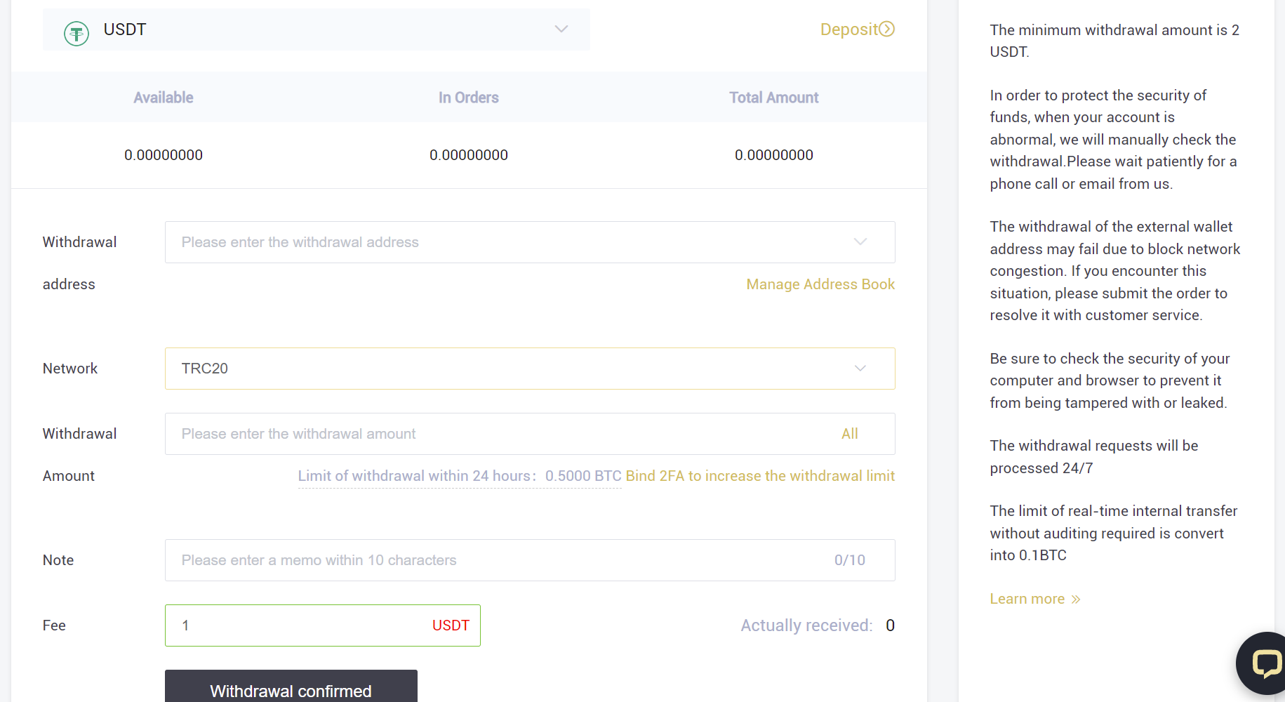 Regresa a LBank, y pega la dirección de Binance. Lo siguiente en network/red, indicaremos la misma red que hemos indicado en Binance, Tron (TRC-20). Para terminar, indica la cantidad y verifica toda la información indicada. Pulsa en withdrawal confirmed y confirma el retiro.