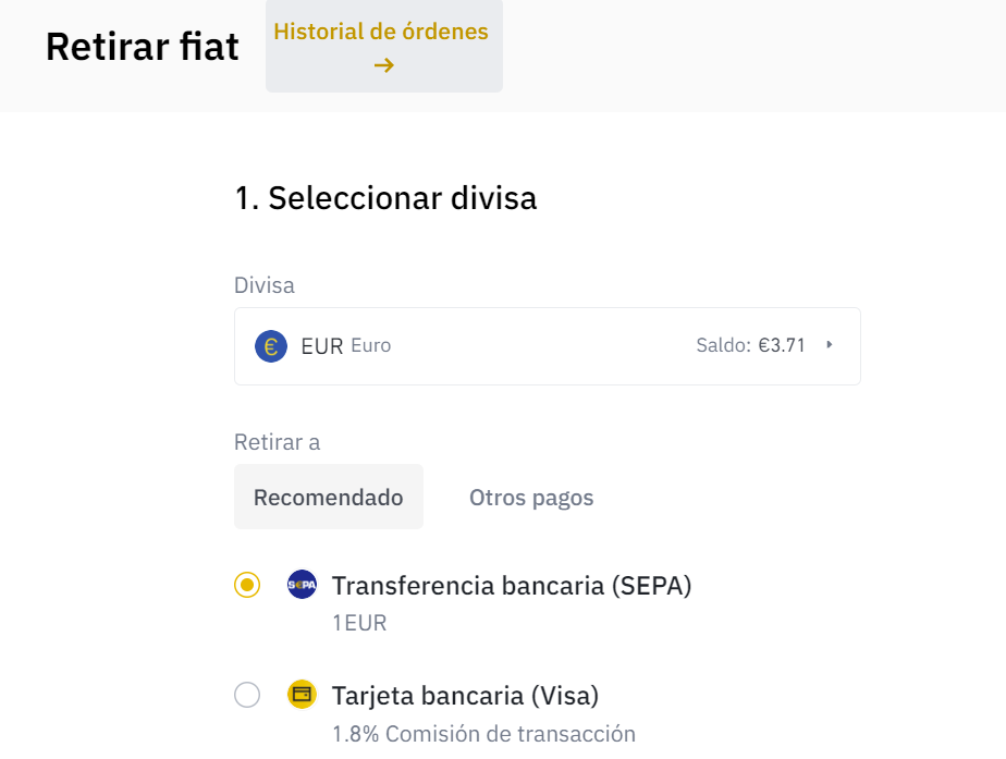 Des del panel principal, podrás pulsar en retirar o withdraw. Y después ir a FIAT para retirar nuestra divisa. Lo siguiente, en FIAT será seleccionar nuestra divisa y el método de pago para que puedan hacer el pago de esta forma seleccionada.