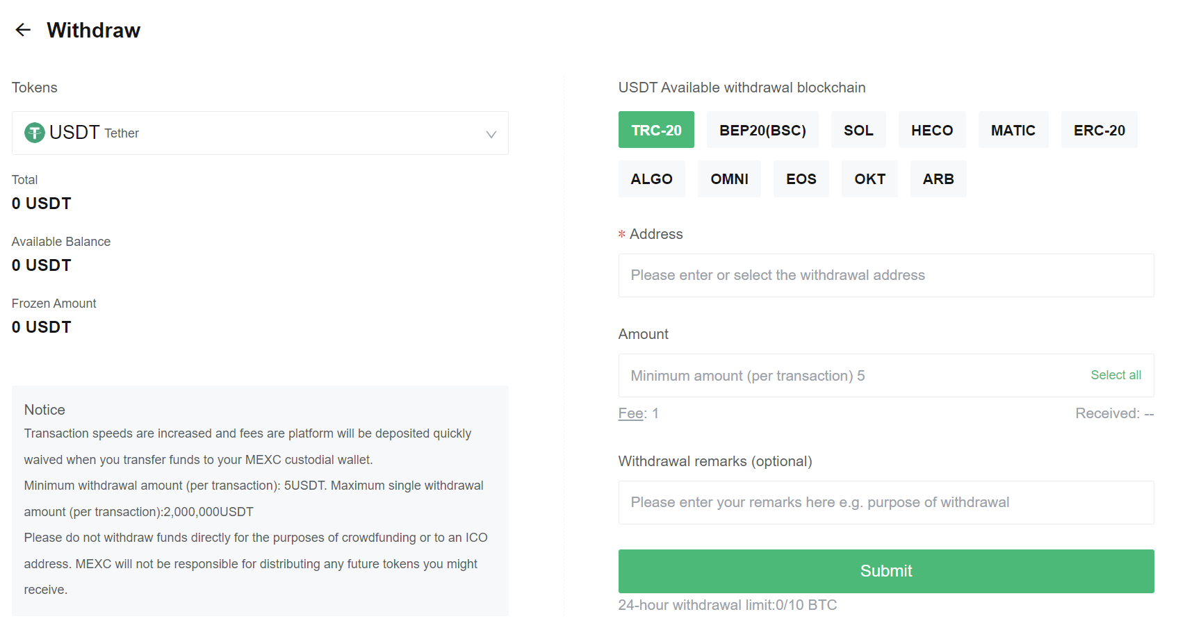 Una vez tengamos USDT en nuestro balance, iremos a wallet y overview. Aquí, buscaremos USDT y pulsaremos en withdraw o retirar. Ya viene de serie seleccionada la red TRC-20 y lo dejaremos así. Si no es tu caso, selecciona la red TRC-20, ya que es la más rápida y ecónomica para mover tus fondos.