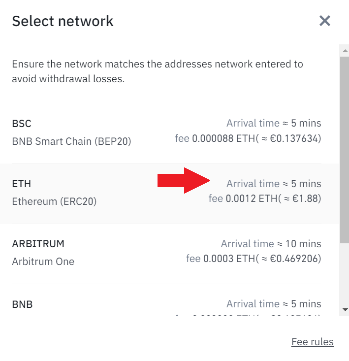 Sobre todo, comprueba que indicas la red correcta. Con la red, solo falta indicar la cantidad que queremos retirar. En el caso de la red de Ethereum, la comisión por retirada es de 0,0012 ETH, en este momento menos de 2$. Aunque la comisión varía y puede llegar a ser superior en el momento que estés haciendo el retiro.