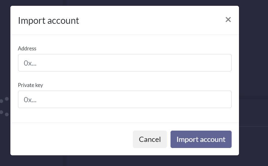 Si no te funciona, puedes pulsar en account, import account. AquÃ, deberemos indicar la dirección de nuestra wallet de metamask y la private key. Para conocer tu private ket, pulsa en los 3 puntos arriba a la derecha, account details o detalles de la cuenta. Verás una opción de export private key. Pulsa allÃ, y indica tu contraseña para descargar la clave privada. Ten en cuenta que esta clave da acceso a tu wallet de metamask, asà que no la compartas con nadie.
