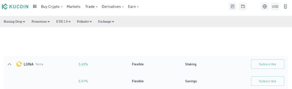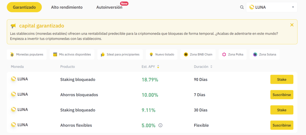 Por último, encontramos los Exchange centralizados, de los cuáles podemos encontrar staking de Luna en KuCoin y Binance entre muchos otros. Pero son los Exchange centralizados más usados y que cuentan con esta opción. Realmente en este momento, binance ofrece una buena rentabilidad por hacer staking con tus Luna, aunque debes bloquearlas, mientras que Kucoin ofrece un interés más bajo. Aun asÃ, es otra gran alternativa si no quieres complicarte a usar una wallet y quieres tener tus criptomonedas en un Exchange centralizado de confianza.