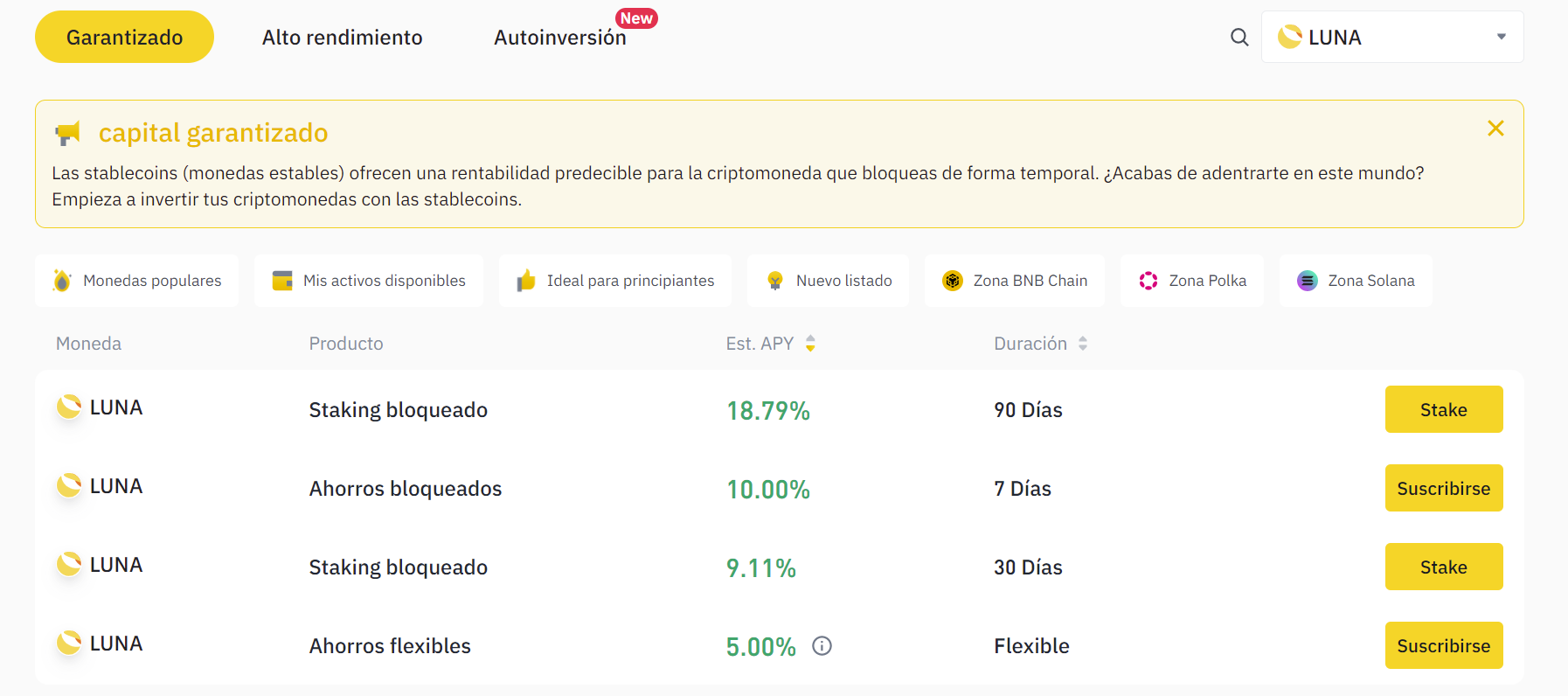 Es muy probable que los % que veremos varÃen cuando estes leyendo esto, por lo que te recomiendo ir a la propia plataforma donde tienes interés en hacer staking de tus Luna y ver donde puedes conseguir mejores rendimientos. Aunque los % varÃen, habitualmente las estrategias o plataformas que mencionaremos que suelen tener mayor % anual, seguirá siendo asÃ.