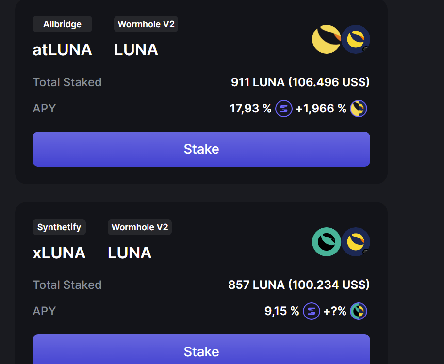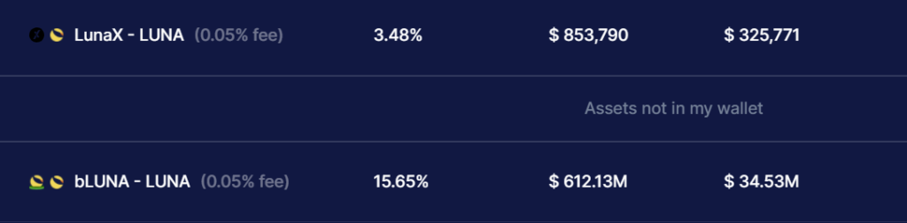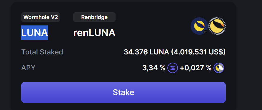 Por último, vamos a ver saber, que a diferencia de todo lo visto anteriormente, se encuentra en la red de Solana. Aun asÃ, en ocasiones hay buenos % anuales que pueden merecer la pena mover nuestras Luna a esta red para hacer farming y sacar una buena rentabilidad anual. En este caso, encontramos pares como Luna-renLuna, atLuna-Luna o xLuna-Luna que se encuentran en la red de Solana. A continuación, puedes ver algunos ejemplos.