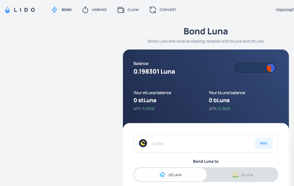 Vamos con la principal estrategia que usa Anchor protocol, y tienen más riesgo. SI eres nuevo en DEFI, te recomiendo que te informes antes de seguir esta estrategia. La estrategia giran entorno a bluna, que es bonded luna, con el mismo valor de Luna que puedes conseguir en Anchor, y puedes cambiar tus Lunas a blunas.