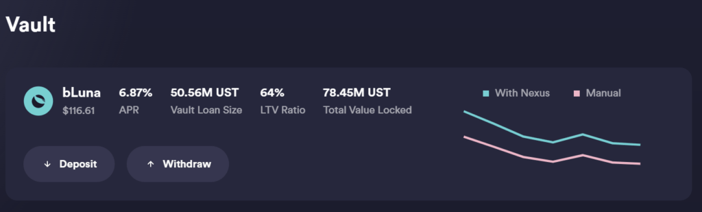 Nexus protocol es una forma de optimizar tu estrategia de staking que hemos comentado en Anchor Protocol. Donde obtendrás mayor rentabilidad limitando el riesgo de ser liquidado. Ya que la plataforma de Nexus esta constantemente usando el máximo LTV o Loan to value ratio, que es la cantidad que puedes pedir prestado en Anchor para maximizar las ganancias.
