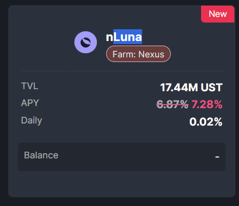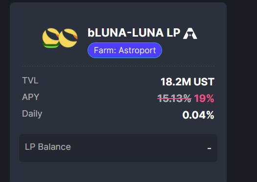 Con la aparición de staking lÃquido como bluna o stluna, han aparecido oportunidades de farming con LP Tokens que tienen muy poca o casi ninguna impermament loss, ya que van ligados al precio de Luna. Esto permite conseguir una buena rentabilidad creando el LP, superior a hacer staking de tus Luna con hasta un 15-20% anual.
