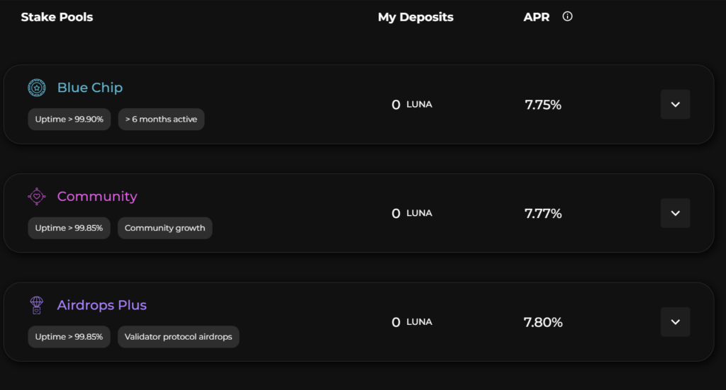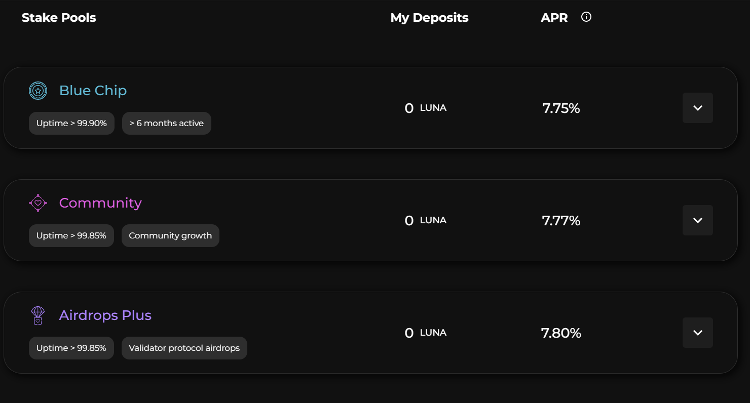 Stader tiene similitudes con Nexus Protocol, pero en vez de optimizar el staking de Anchor, optimiza el staking que haces al delegar tus Luna en Terra Station. Puedes ver a continuación las diferentes 3 estrategias, y el % anual y compararlo con el que recibes en terra station.