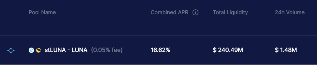 Astroport al ser el principal DEX de terra es muy probable que puedas encontrar siempre los mejores % de LP’s de Luna con otro par de luna como puede ser bluna o stluna. También hay que considerar que en bluna-luna recibes el token de la plataforma astroport, mientras que en stluna-luna, recibirás una pequeña parte del % anual en LDO, el token de Lido. Si quitas esa recompensa, el % anual es muy parecido.