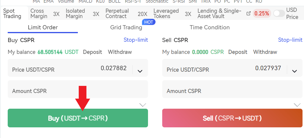 Vedrai il pannello per comprare e vendere criptovalute, qui, cerca CSPR, e vedrai la coppia CSPR/usdt.