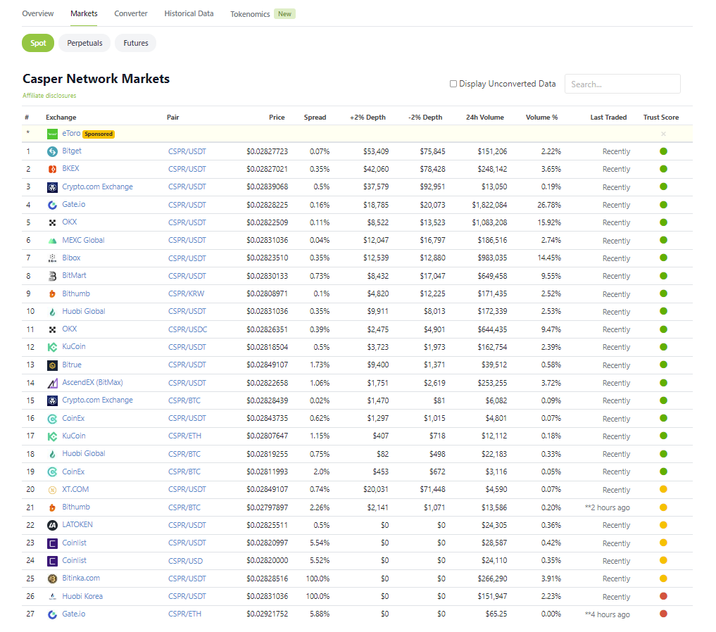 Una volta lì, cliccate su mercati e vedrete tutte le piattaforme che hanno elencato questa criptovaluta. Per risparmiare tempo, potete vedere le piattaforme principali nell’immagine sottostante.