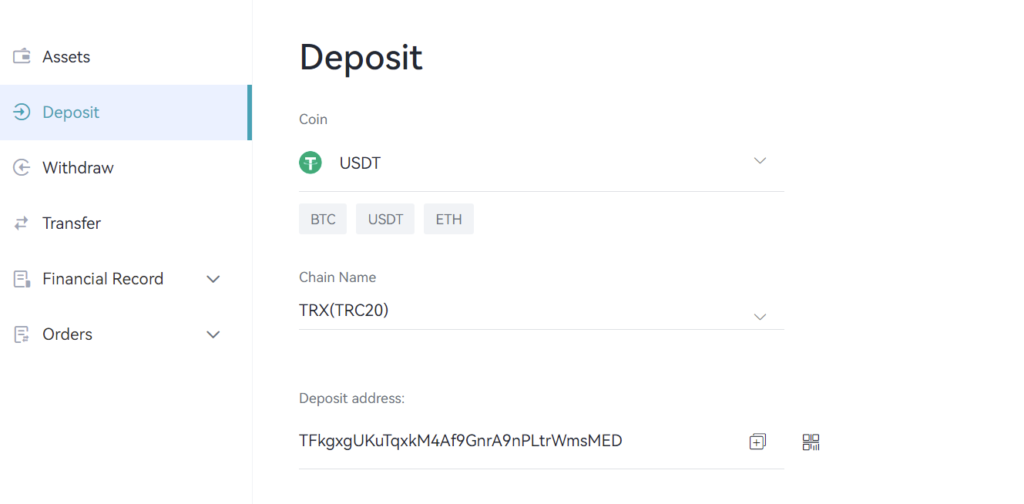 La prossima cosa di cui abbiamo bisogno è l’indirizzo dove depositare gli USDT. Per farlo, andate su Bitget alla voce asset e cercate USDT. Cliccare su deposito. Qui si seleziona la rete Tron (TRC-20) e si vedrà l’indirizzo da copiare. È possibile fare clic sulla destra dell’indirizzo per copiarlo.