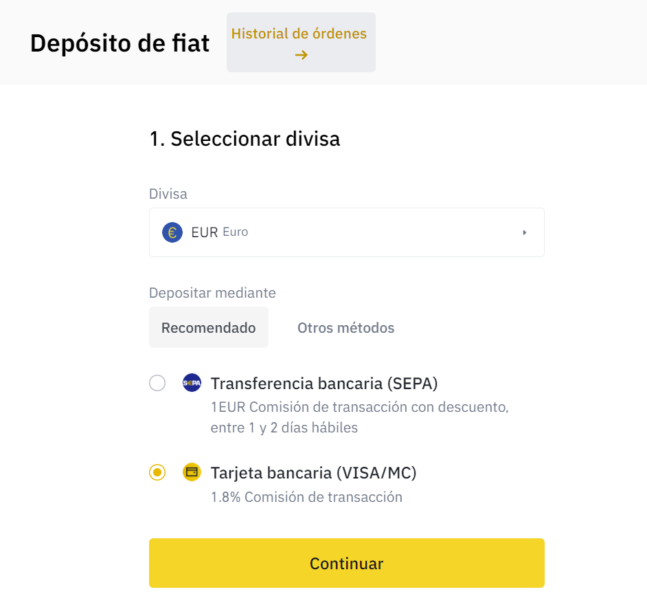 La prima cosa da fare è depositare i fondi in binance, sia in eurodollari che nella vostra valuta. Utilizzeremo la carta di credito per ottenere immediatamente il denaro. È possibile utilizzare il bonifico bancario, se si vogliono pagare commissioni ancora più basse e per importi elevati, ma ci vorranno diversi giorni prima che appaia sul saldo.