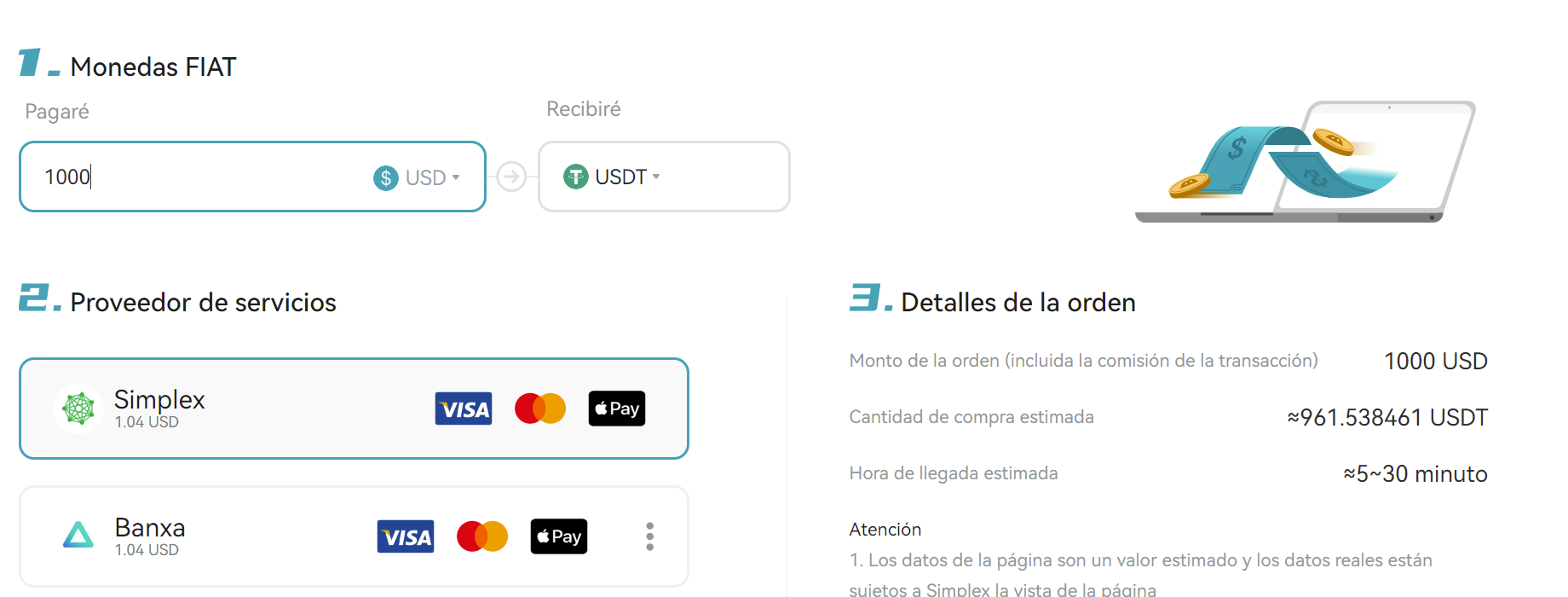Pertanto, nel nostro caso selezioneremo USDT, e nella cambiale l’importo che si desidera piazzare. Inoltre, selezionate la valuta in cui pagherete: dollari, euro o altro. Per quanto riguarda il fornitore di servizi, sono disponibili diverse opzioni e vi consiglio di selezionare quella più economica. Di solito è simplex o banxa.