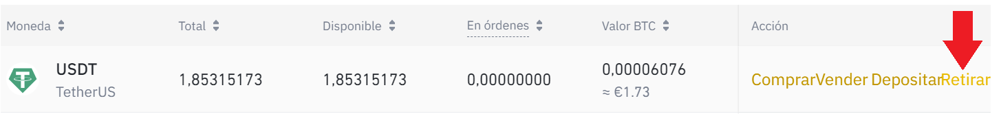 Tornate al pannello principale e dovreste essere in grado di vedere l’USDT. Con l’usdt nel nostro conto, andiamo su spot wallet e cerchiamo usdt. Da mobile, è sufficiente cercare USDT nel saldo del proprio conto spot. A questo punto, fare clic su prelevare o ritirare. A questo punto verrà visualizzato il pannello di prelievo di Binance.